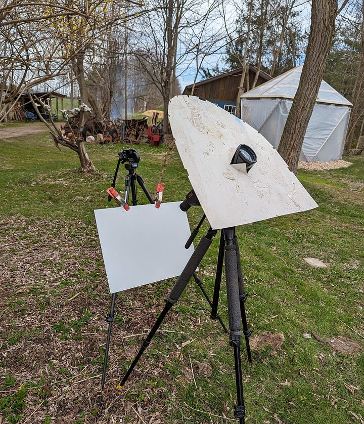 My dad set up the scope in eclipse viewing mode in case the clouds cleared. Before the clouds swallowed up the whole sky we had some clear moments and did get to see some sun spots. But the fleeting moments of sun passed and he retired to his wheelbarrow1.